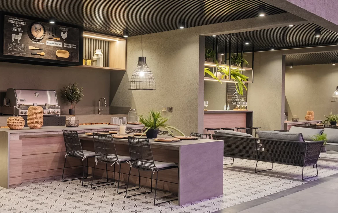 Cocina con piso de porcelanato, cubierta de cuarzo, equipada con encimera vitroceramica, horno eléctrico y campana extraíble.