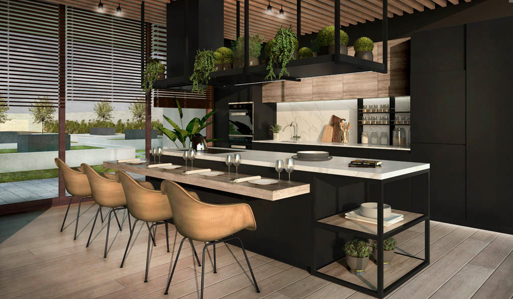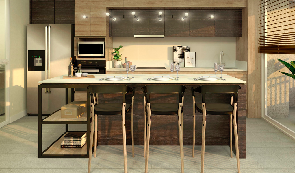 Cocina con piso de porcelanato, cubierta de cuarzo, equipada con encimera vitroceramica, horno eléctrico y campana extraíble.