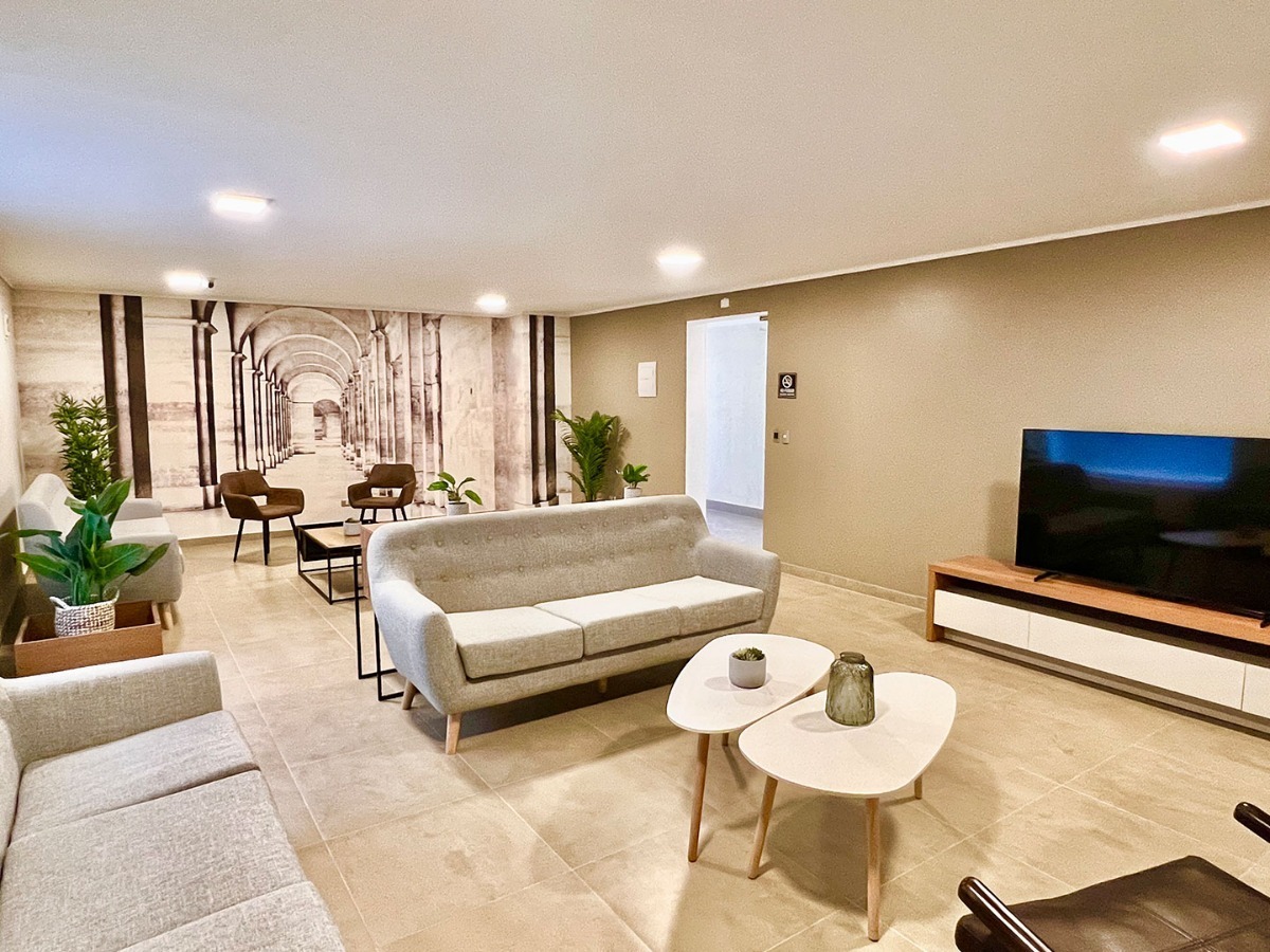 → Sala estar con vista panorámica en piso 25 y terraza con piscina